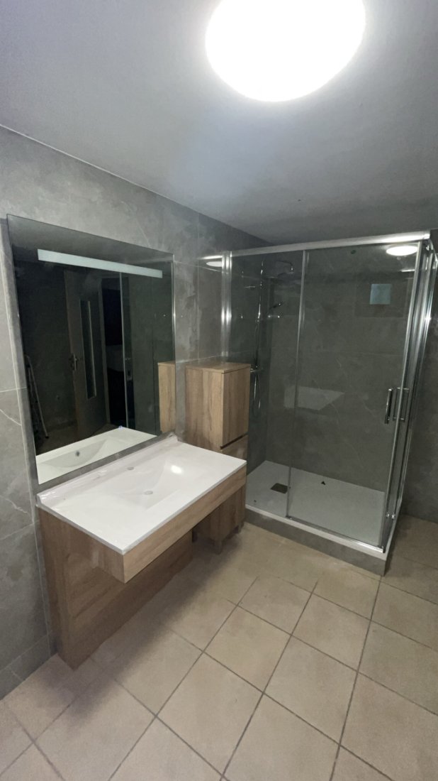 Salle de bain rénovée à Saint Ismier : carrelage moderne, douche à l’italienne et robinetterie design installés par SANIT 'AIR CONFORT, expert plombier climaticien au service de votre confort.